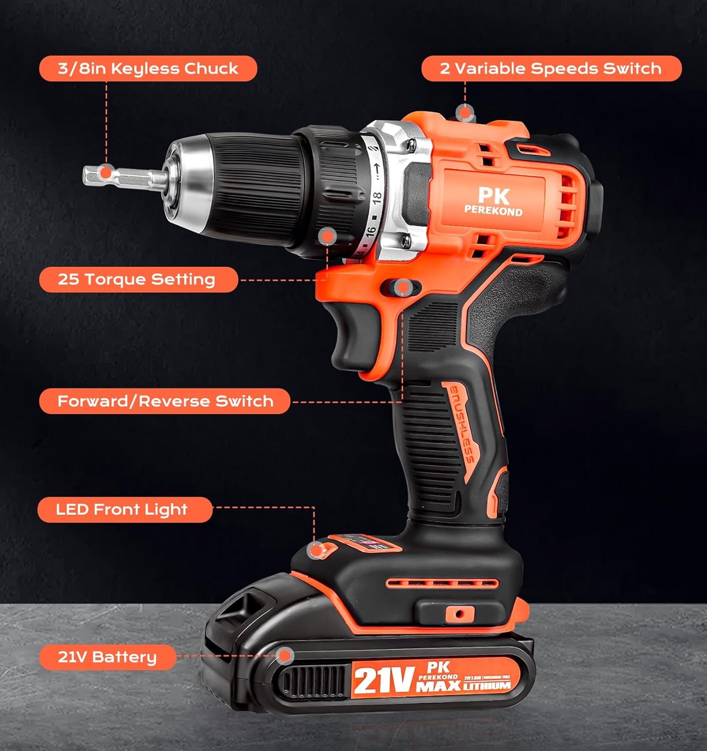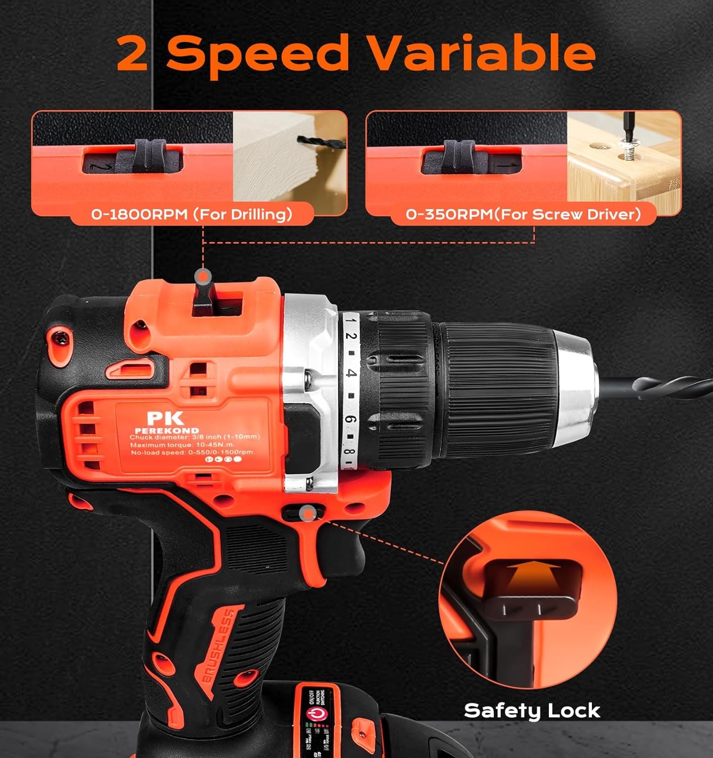 • ? [New Version 2.0 Brushless Motor] Powered by PKperekond improved brushless motor, this 60Nm drill significantly reduces noise and ensures a longer battery life. It performs perfectly in drilling wood and metal, replacing screws, turning nuts and stripping wires, while reducing the risk of motor overheating. The model adopts 2023 upgraded appearance, with a compact structure it can provide utmost safety for everyday use.
