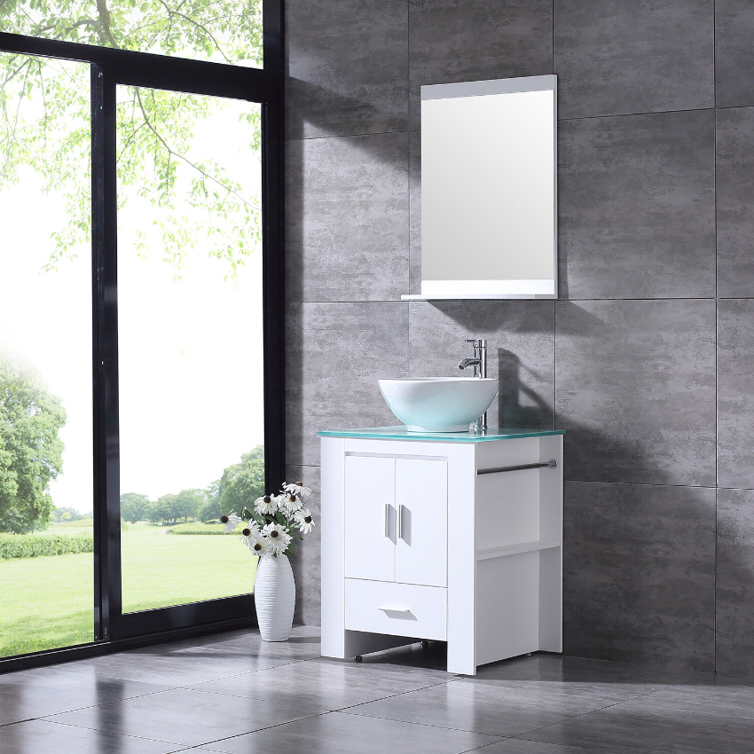 24" Modern Bathroom Vanity Plywood Cabinet Ceramic Vessel Sink Faucet Drain Set