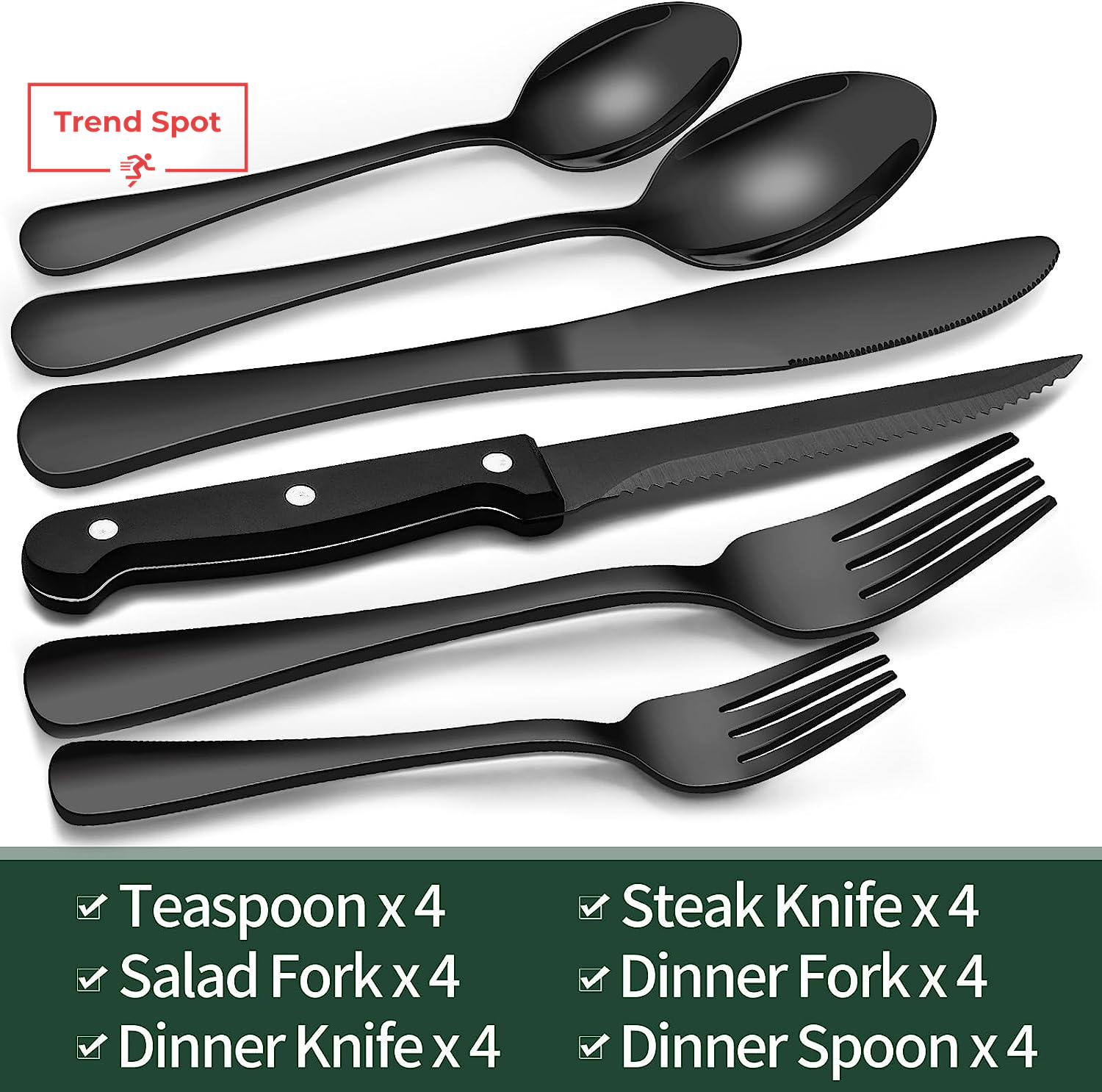 24-Piece Black Silverware Set with Steak Knives, Black Flatware Set for 4, Food-