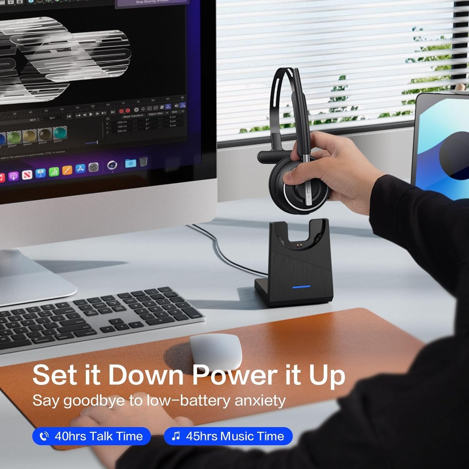 Bluetooth Headset, Wireless Headset with Microphone for PC, V5.2 Computer Headset with Noise Cancelling Mic, USB Dongle, Charging Base & Mute Button for Work, Cell Phones, Computer (Black)
