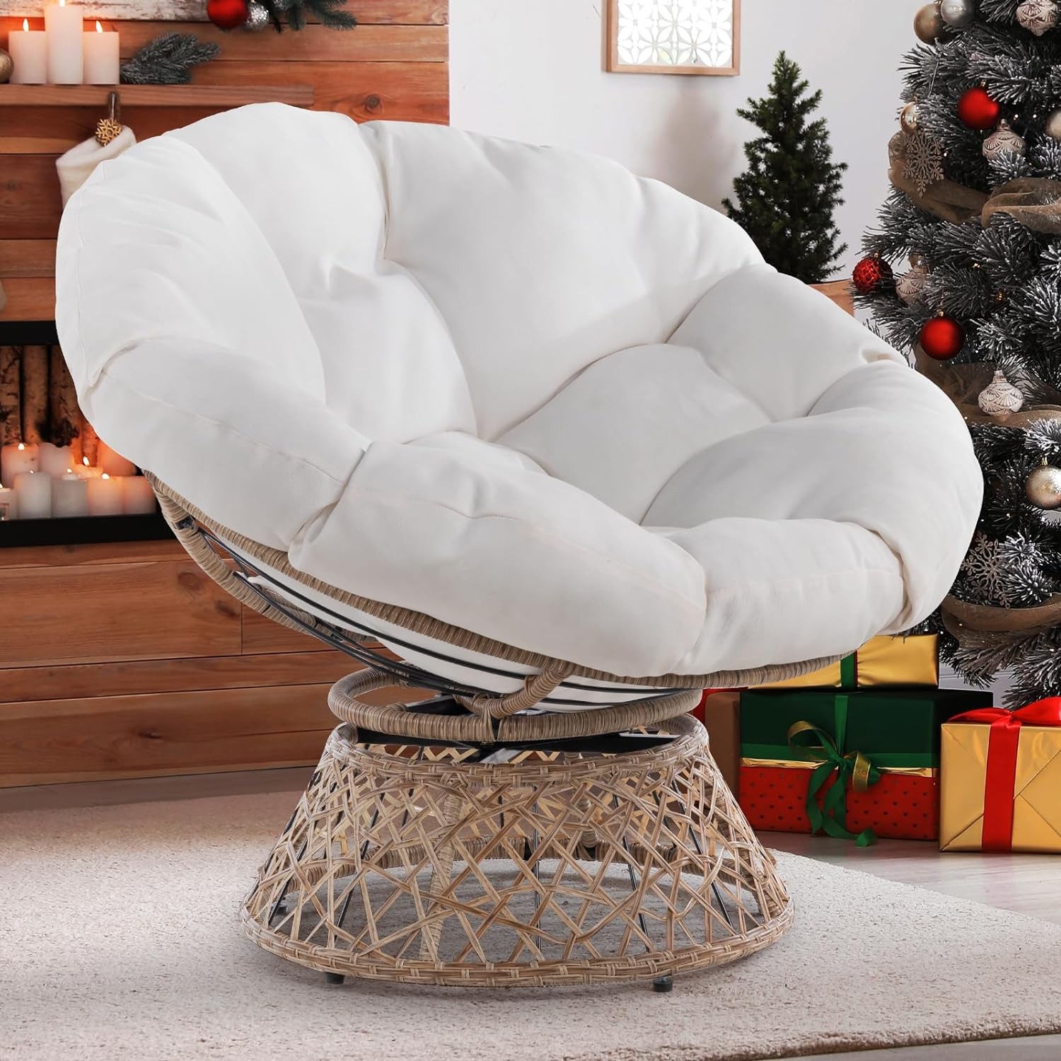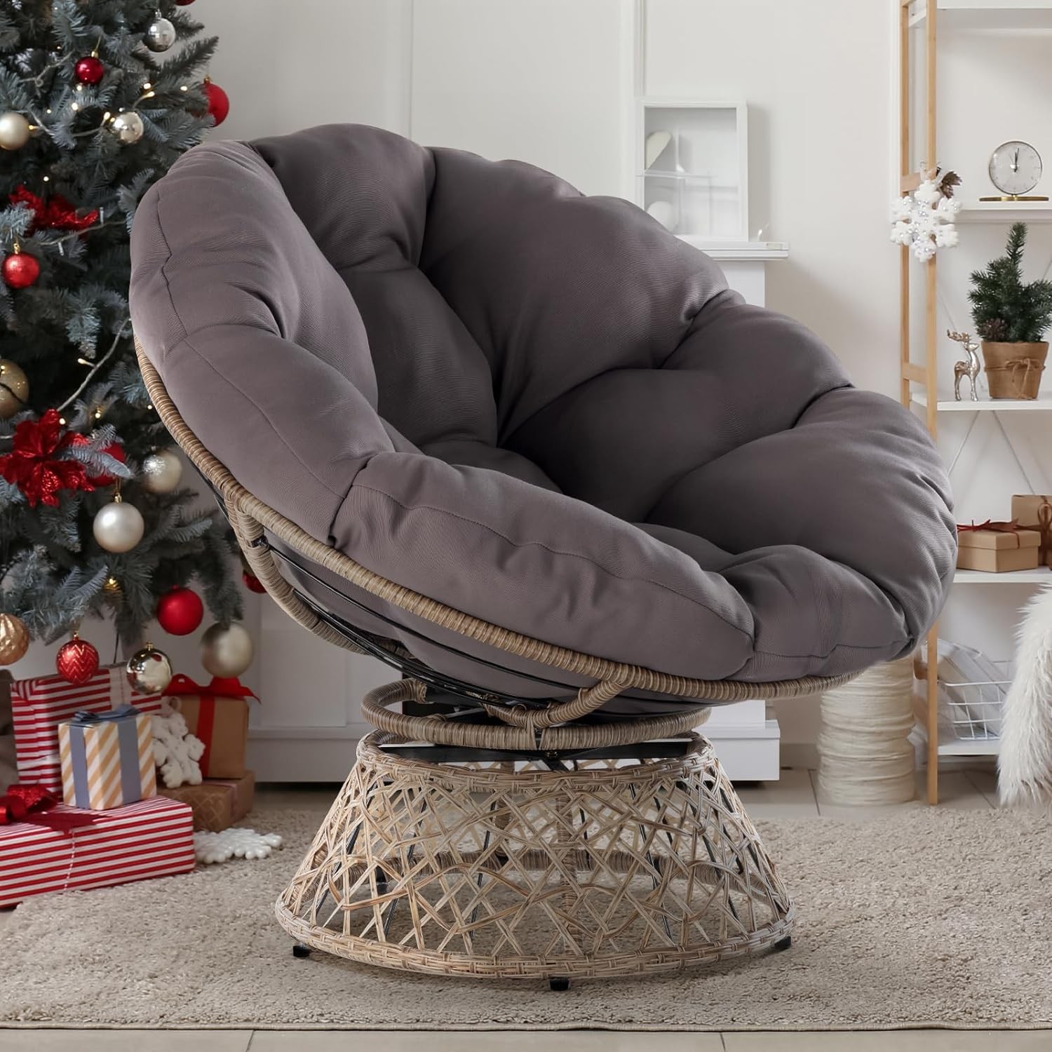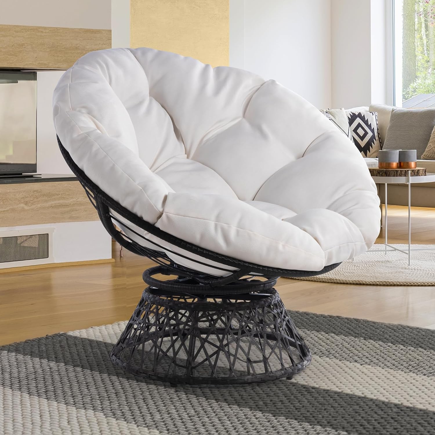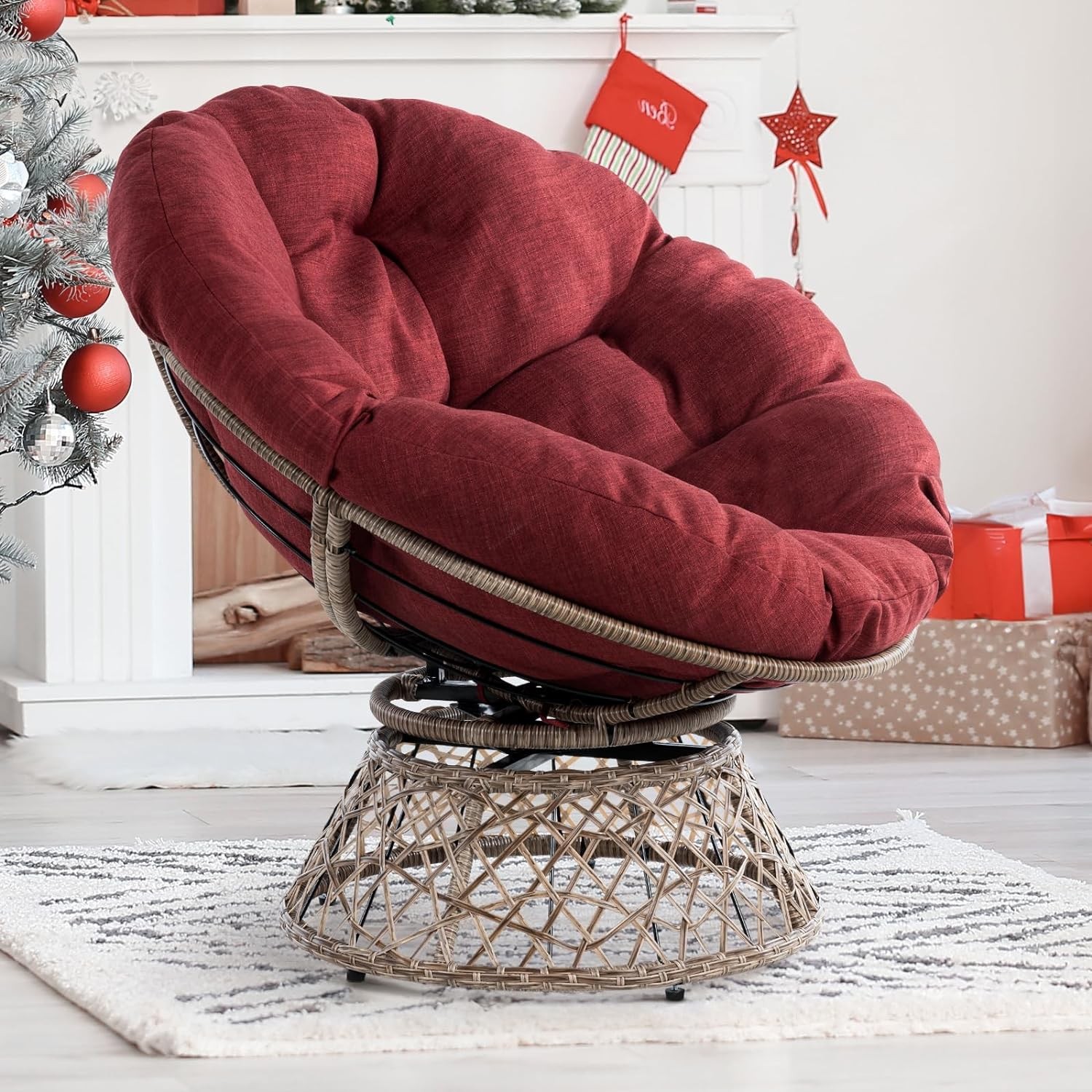 • 360 DEGREE SWIVEL PAPASAN CHAIR: The papasan chair frame is made of solid metal and expertly woven resin wicker; 360 degree swivel papasan chair base has a smoothly rotating structure without noises and friction; Five levelers protect your floor and are easily adjustable for stability of wicker papasan chair