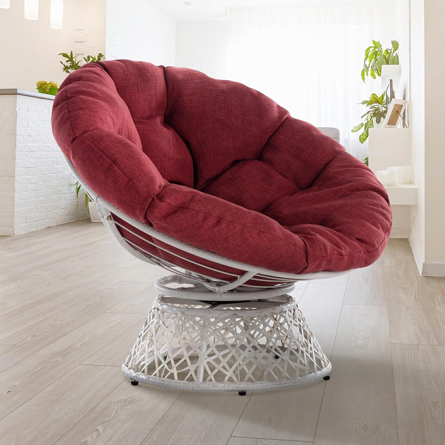 • HEAVENLY COMFORT WITH PLUMP CUSHION: Our upgraded papasan chair cushion has 9.48 pounds of extra padding fiber, 6 3/4 inches thickness, plus an airy TC inner fabric for added comfort and coziness; Three straps secure the large papasan cushion on the round wicker chair frame, preventing it from slipping away; The cushion should be shaken and fluffed up regularly to maintain the shape