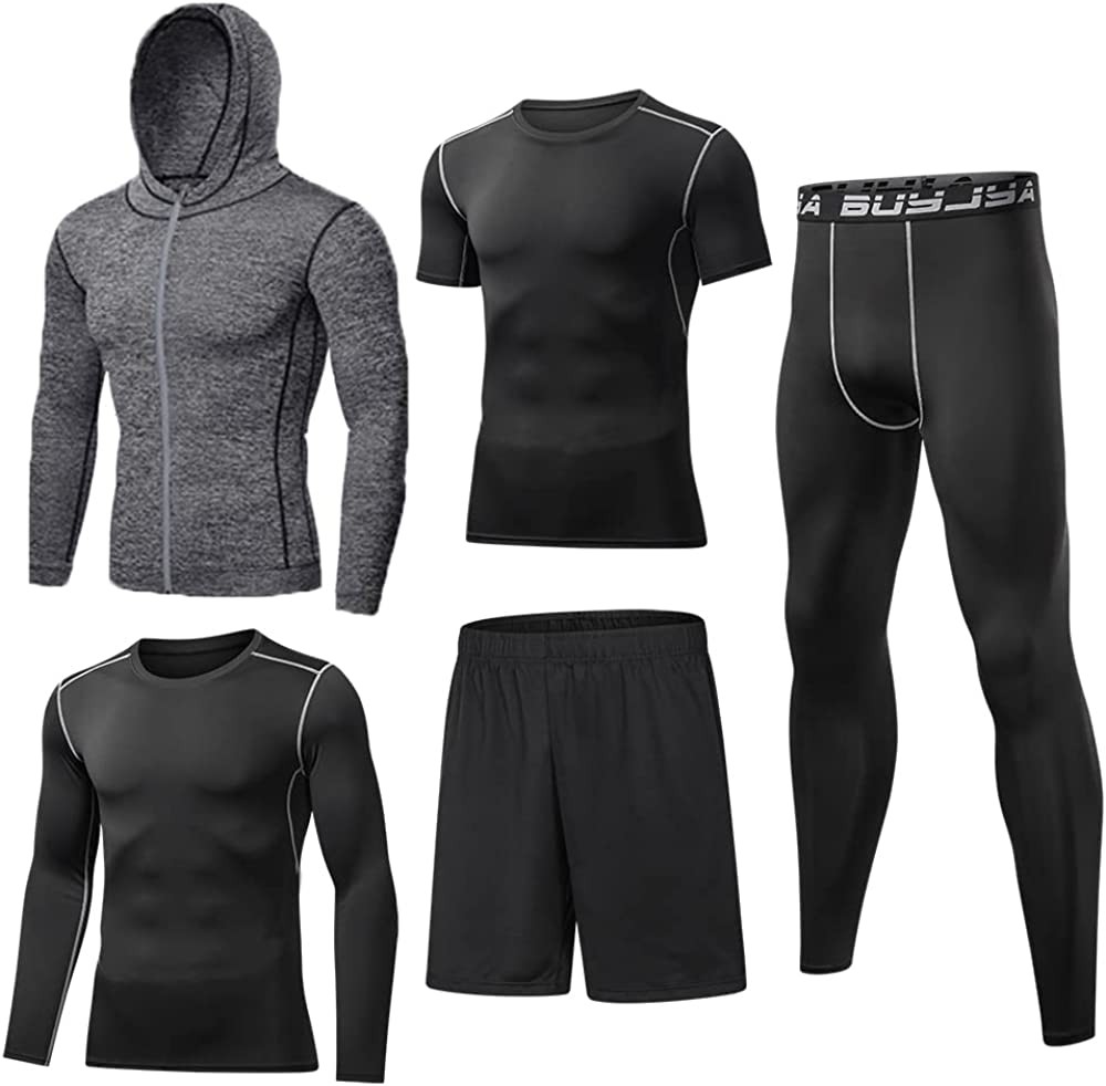 BUYJYA 5Pcs Men's Compression Pants Shirt Top Long Sleeve Jacket Athletic Sets G