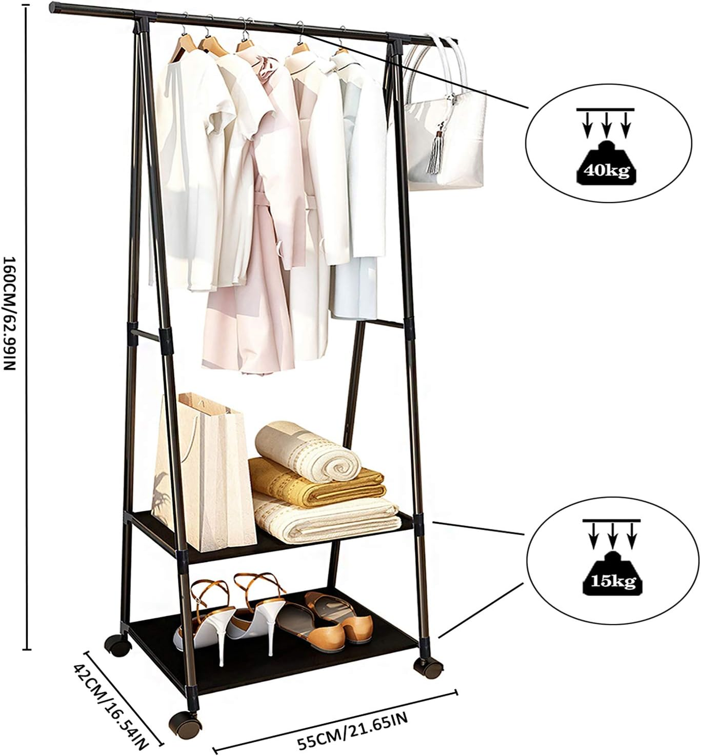 Jecpuo Clothes Rack Small Metal Garment Rack with Shelves for bedroom Rolling on