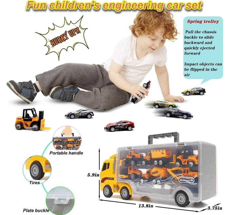 This 13-in-1 truck toy set serves as a birthday/party/Christmas gifts for children, so your child can receive both a large transport truck and 6 small construction/fire trucks and 6 small racing cars.