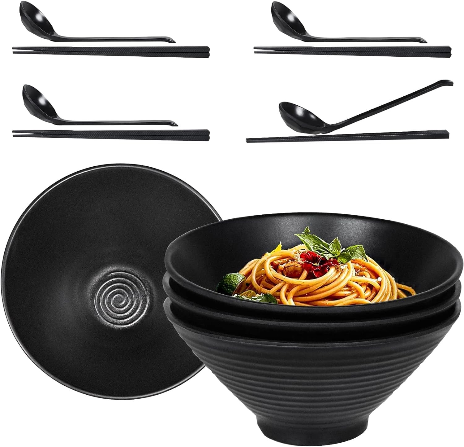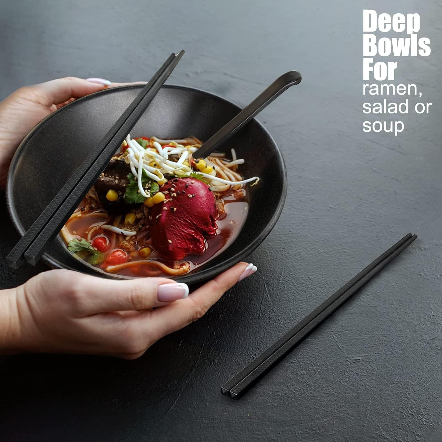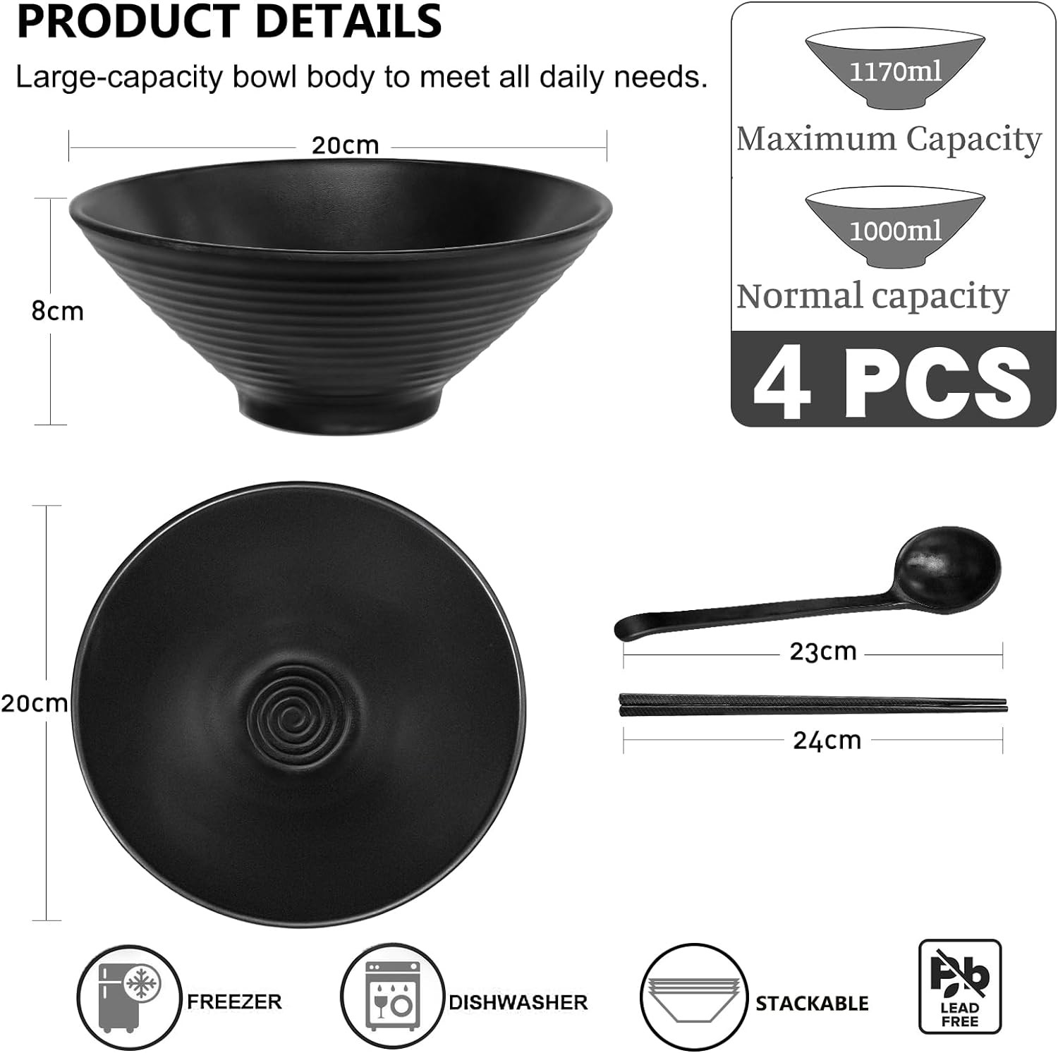 Set of 4 Ramen Bowl Set, 40 oz Melamine Large Japanese Style Noodle Soup Bowls Set with Spoons and Chopsticks for Ramen, Pho, Noodles, Asian Dishes Black,Large Bowl for Adults| Dishwasher Safe