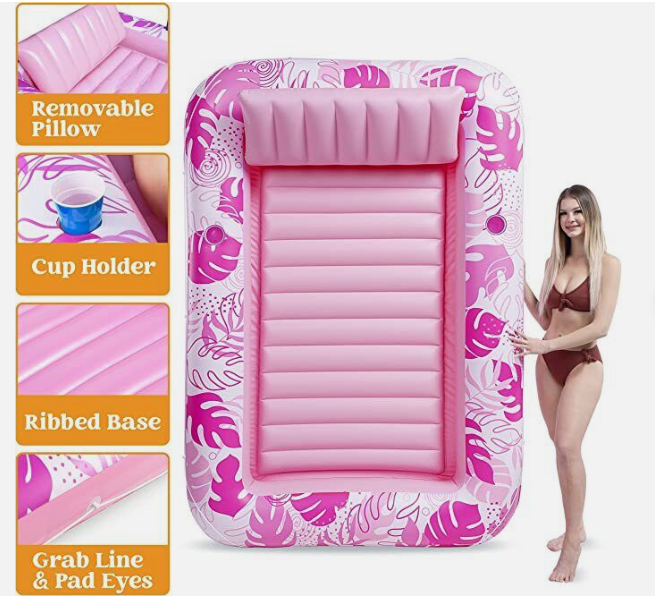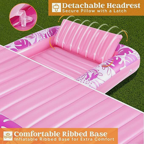 • INCLUDES. Packaged includes one 85” x 57” extra large inflatable suntan pool float featured with Inflatable base for extra comfort, two 3”drink holders, one removable headrest, wrap around rope