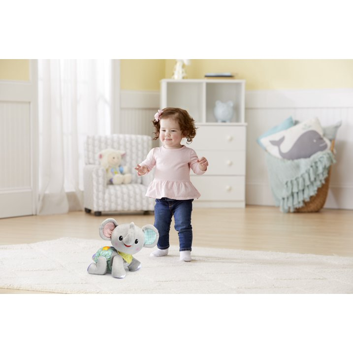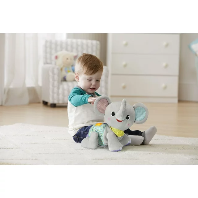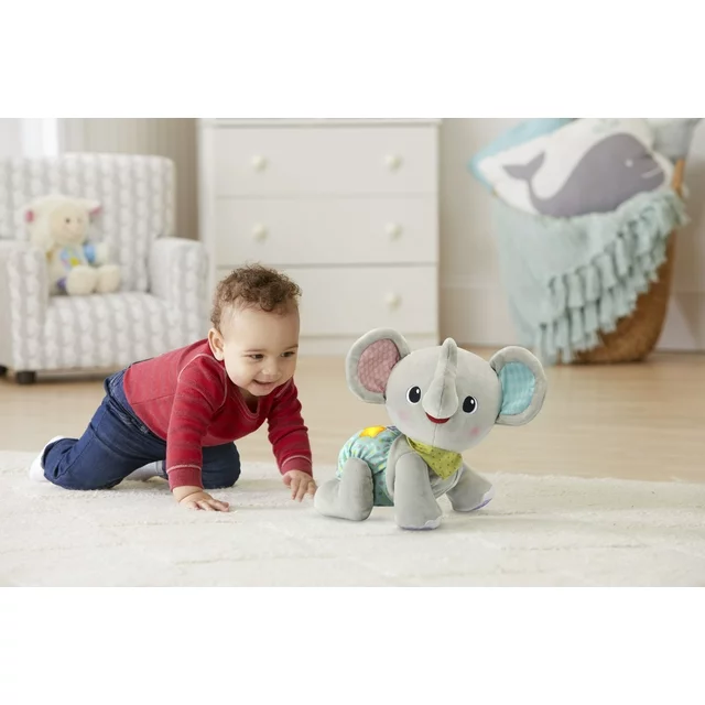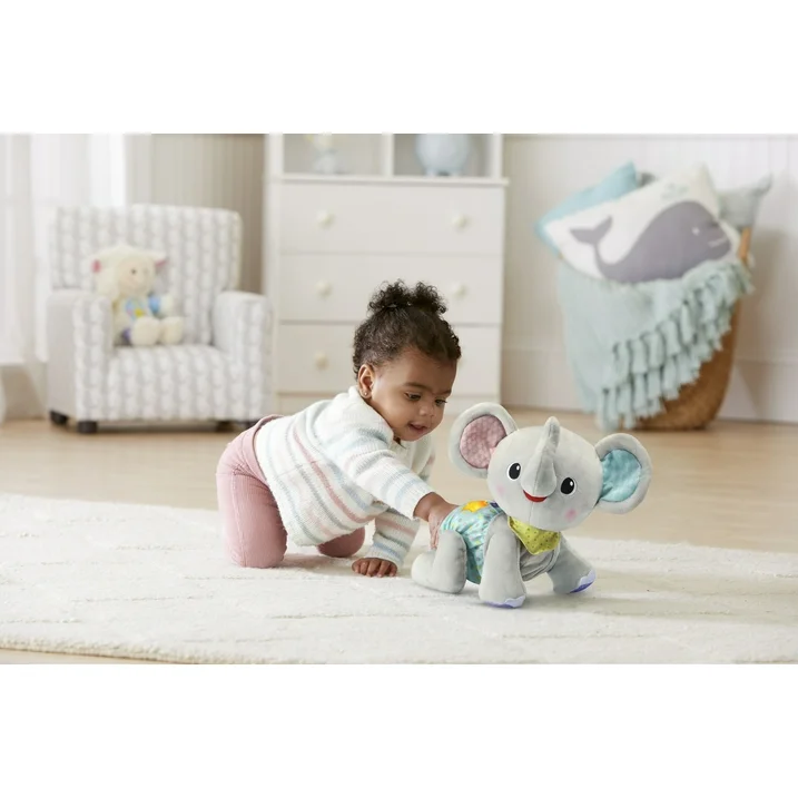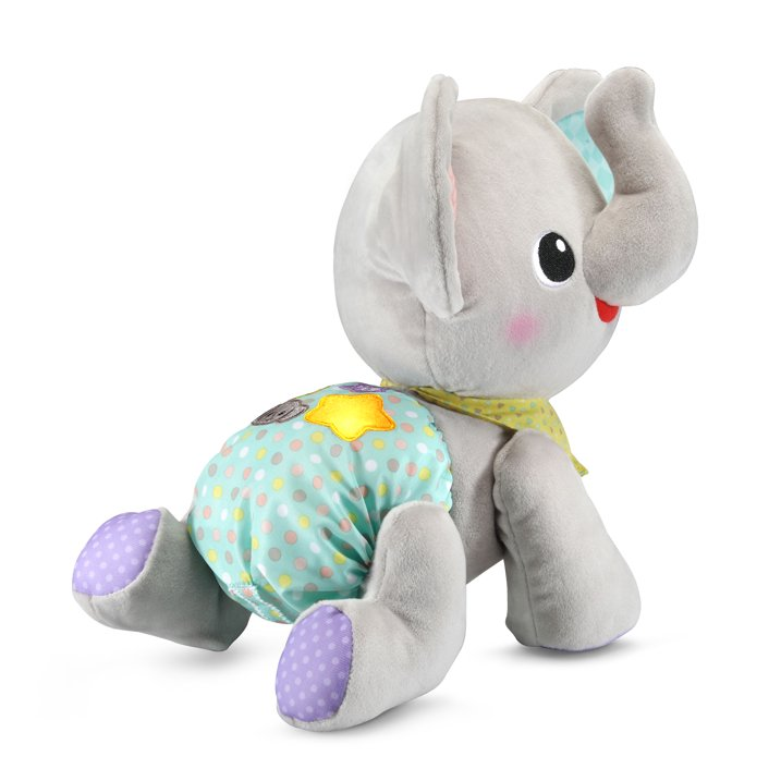 • The crawling, ear-flapping elephant encourages gross motor development as little ones crawl and walk after him