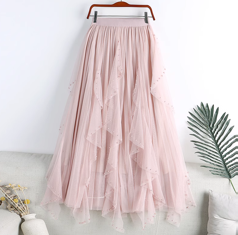 Women Mesh Ruffled Skirt A-line Beaded Gauze Half Dress High Waist Swing Skirt